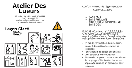 Cire d'olive végétale sans OGM. Parfum de Grasse garantie sans CMR ni Phtalates. Mèche en coton. Non-testé sur les animaux. Contenant réutilisable.